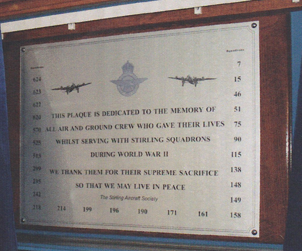The Memorial itself includes a display of photographs of Stirling aircraft and crew, and a commemorative plaque.